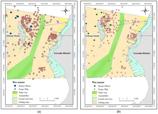Maps illustrate Bryde’s whale sightings in correlation with the distribution of human activities (a) in the dry season and (b) in the wet season.