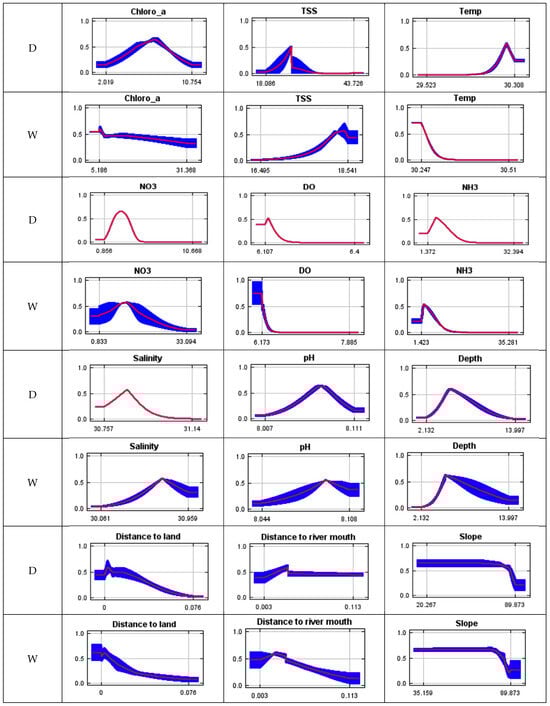The table shows a response curve graph illustrating the relationship between environmental parameters. The curves show the mean response of the five replicate MaxEnt runs (red) and the mean +/− one standard deviation (blue, two shades for categorical variables). D is the dry season, and W is the wet season.