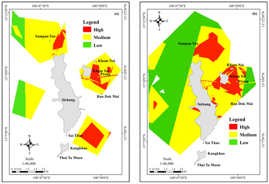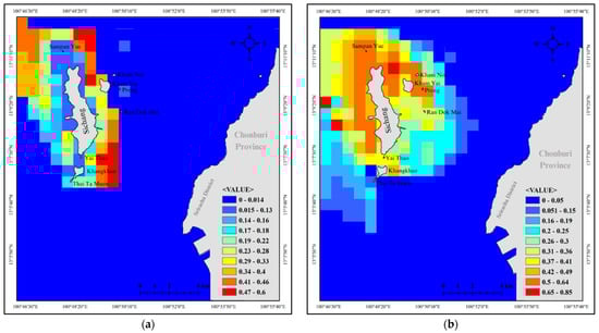 Map output shows the cumulative risk from all stressors on Bryde’s whale. The risk map shows the geographical regions where Bryde’s whale and human activities overlap during both seasons. The map is divided into three levels of risk, with the red areas indicating high risk, yellow indicating moderate risk, and green indicating low risk as shown in Figure 13. This map assesses risk by focusing on the species’ occurrence and how it changes depending on the distribution of stressors on the species. The risk map presentation is based on predefined criteria, which involve analyzing the risk values from pollution sources and threats that can affect the health and food sources of Bryde’s Whale. Based on the map output, it is evident that certain areas pose a high risk due to the overlapping human activities that take place during both seasons. These areas are located in the cargo ship anchorage, fishing grounds, and shipping lanes from Sichang Island to Siracha. During the dry season, high-risk areas are found to the north of Sichang Island, east of Kham Yai Island, and south of Sichang Island, as shown in Figure 13a,b, showing the result of the wet season in three particularly vulnerable areas. The first area is situated in the northeast and western part of Sichang Island. The second area is the coastal activities around Sichang Island. The third area is around Kham Yai, Kham Noi, and Prong Island, as shown in Figure 13b.