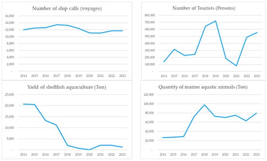 During the study period analyzed in this research, from 2019 to 2023, which encompasses the COVID-19 pandemic, human activities related to transportation, tourism, and marine resource management were significantly impacted. The report indicates that lockdowns and travel restrictions led to a temporary decline in maritime activities, fishing operations, and tourism-related activities [46]. According to the data shown in Table 5, it indicates that there was a decline of about 11.52% in the total number of boats in the research area during 2015. Ship calls increased until 2019, after which they decreased in 2020–2021, reflecting disruptions in international trade and transportation. However, a gradual recovery was observed in 2022 and 2023, aligning with trends in tourism, where visitor numbers significantly declined from mid-2020 to early 2022. Although tourism returned to near-normal levels in 2023, with a strong recovery in 2022 and 2023, it is projected to increase significantly in the coming years. The production from aquaculture and capture fisheries both decreased concerning fishery activities. Production in the aquaculture industry began to decline in 2016, at its lowest point in 2020 and then increased in 2021–2022. Capture fisheries, on the other hand, reported declining landings in 2019–2020 before seeing an increase in 2023 as shown in Figure 14. Preliminary analysis of these data suggests that these changes may have influenced human pressure levels in the study area, potentially leading to an underestimation of human activity during “normal years” and affecting the outcomes of risk assessment models.