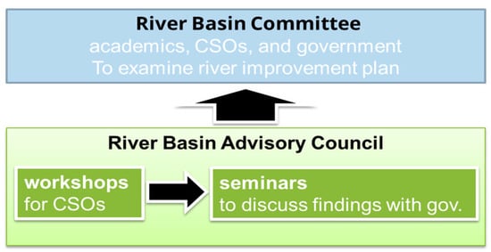 The example of Tamagawa River Basin is regarded as a good practice of formulating river improvement plans [23]. MLIT established a “River Basin Committee” in 1999 consisting of academics, CSOs, and government agencies to examine a river improvement plan. The Tamagawa River Basin Advisory Council was established in 1998 for the purpose of the continuous exchange of information and opinions among government agencies, CSOs, academia, and the private sector to realize a good river and good towns in the river basin (Figure 2). The council aimed to reach a loose consensus through mutual cooperation and deepening trust. The council organized a series of workshops for CSOs to consider river improvement works as well as river basin seminars to discuss their findings with government agencies. These outputs were reflected in discussions with the River Basin Committee, and the River Improvement Plan was formulated in 2001. The plan featured the following advanced measures: (1) comprehensive flood protection, comprehensive river flow management, and biodiversity conservation and restoration measures that took into account the entire river basin; (2) soft measures such as “flow analysis” and the “establishment of the Tama River Museum”; and (3) cooperative and integrated measures that reflected the opinions of neighboring municipalities, residents, NPOs, and academic experts.