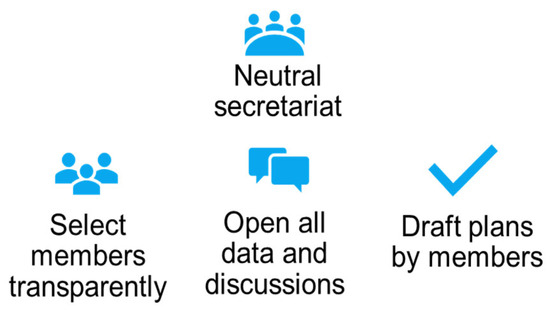 While the Yodogawa River Basin Committee failed to formulate an authorized river improvement plan, committee mechanisms were regarded as innovative in stakeholder participation and consensus-building [24,25] (Figure 3). Committee members were selected transparently in 2000. The secretariat was outsourced to a private company and functioned neutrally. Various regional and thematic working groups were formed to examine a wide range of issues. These were very different from conventional approaches where the government acted as a secretariat, selecting members, guiding discussions, and drafting plans.