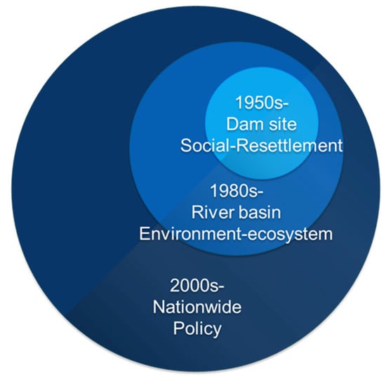 Water governance has shifted from a hierarchical, institutionalized, top-down form of government to a collaborative approach involving more diverse stakeholders in some countries [1,2]. This is because as countries develop and socio-economic conditions change, diverse and sometimes conflicting water needs emerge, requiring coordination and tension resolution among different stakeholders [3,4]. For example, the construction of large, water-related structures must meet the goals of flood damage reduction and water supply while considering social and environmental impacts such as resettlement and ecosystems. These impacts are not considered enough in some countries, particularly developing countries.