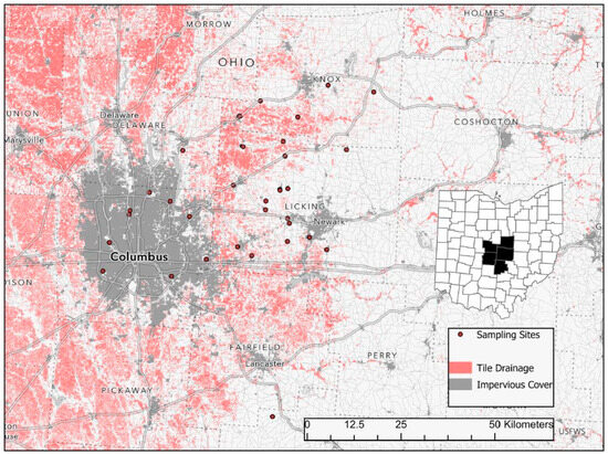 Stream sampling locations, impervious cover, and estimated subsurface tile drainage in central Ohio, USA. Impervious cover was estimated from the 2019 USGS National Land Cover Database [34], and data from Valayamkunnath et al. were used to estimate the area of subsurface tile drainage [35].