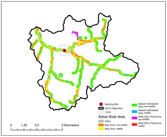 Sampling scheme for spatial and field data in each HUC12 watershed and its Active River Area (ARA; [36]), and 1 km2 zone centered on stream sampling location.