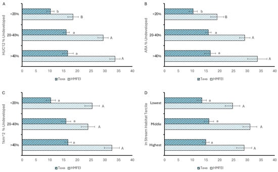 Stream macroinvertebrate taxa and HMFEI (mean ± SE) compared with respect to percentage of undeveloped land at (A) HUC12 watershed scale, (B) Active River Area (ARA) scale, and (C) 1 km2 scale, and (D) with respect to tercile index of instream habitat metrics. Lowercase letters indicate significant differences among taxa in each group, and capital letters indicate significant differences among HMFEIs; α = 0.05.