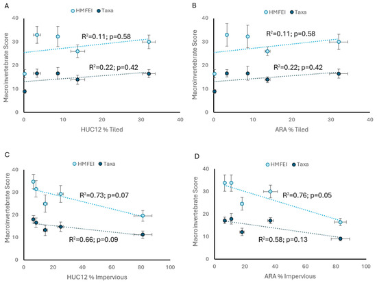 Linear regression of stream macroinvertebrate taxa and HMFEI (mean ± SE) with (A) mean ± SE HUC12 watershed percentage of subsurface tile-drained land; (B) Active River Area (ARA) percentage of subsurface tile-drained land; (C) HUC12 watershed percentage of impervious cover; and (D) ARA percentage of impervious cover. Impervious cover is estimated from 2019 USGS National Land Cover Database [34], and data from Valayamkunnath et al. [35] are used to estimate area of subsurface tile drainage.