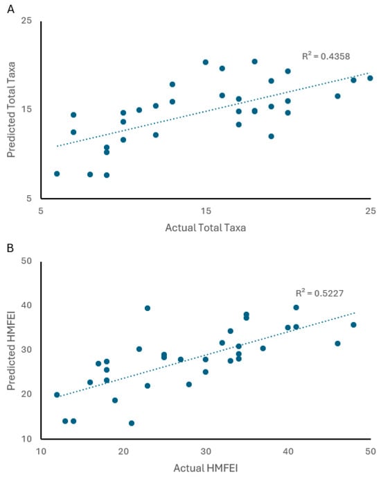 Multiple linear regression of actual vs. model-predicted macroinvertebrate taxa (A) and HMFEI (B) using HUC12 percentage of development and stream sinuosity as predictors.