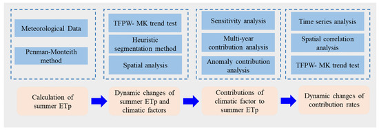 Furthermore, few studies have examined the dynamic changes in the contribution of climate factors to ETp. Accordingly, it is impossible to capture temporal variation details in contributions of different factors to ETp. Recently, Liu et al. (2023) put forward a new method, the anomaly contribution analysis method, which uses the relative changes in meteorological factors and ETp and the sensitivity of ETp to meteorological factors to analyze the contribution of meteorological factors to ETp on different time scales [1]. Compared with the multi–year contribution analysis method [34,35] which is commonly used to evaluate the contributions of long–term trends of different meteorological factors to the long–term trend of ETp, the anomaly contribution analysis method can clearly display the detailed contribution rates of different meteorological factors to ETp at small time scales (e.g., monthly and seasonal scales). Thus, it would offer further insight into the impact of climate change on regional water balance by assessing the driving patterns of climatic factors on ETp. For example, summer ETp generally accounts for a large proportion of the annual ETp and has important implications for the evolution of regional droughts and agricultural management [6,33,36,37,38,39]. However, there are hardly any studies specifically targeting the characteristics and climatic causes of summer ETp changes.
