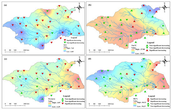 Spatial distribution of multi–year average values and trends of the four climatic factors ((a) Sh; (b) Tm; (c) Ws; and (d) Rh) by the TFPW–MK test across the basin.