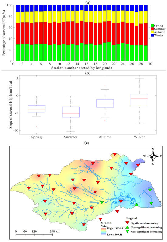 (a) Multi–year average percentage and (b) trend slope of seasonal ETp; and (c) spatial distribution of multi–year average values and trends in summer ETp by the TFPW–MK test.