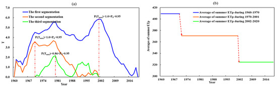 Figure 5a shows an example of identifying the change points in the summer ETp time series of Dangshan station. The blue line in Figure 5a represents the first change point detection process. The maximum T of the first iteration was discovered in 2001, corresponding to P (Tmax) = 1.0 > P0 = 0.95, indicating that 2001 is a change point in the summer ETp time series. As the length of the subsequence 1960–2001 is greater than 25, the recognition process continues. Similarly, the second change point appeared in 1970, represented by an orange line. Then, the third iteration and segmentation process began of the subseries 1971–2001, illustrated by the green line with the third maximum value T that appeared in 1980. However, it is not another change point, as the corresponding P (Tmax) = 0.86 < P0 = 0.95. Finally, the recognition process ends.