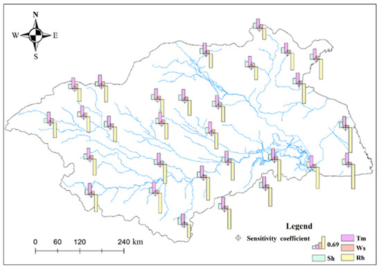 Figure 6 shows the spatial distribution of sensitivity coefficients of summer ETp to Sh, Tm, Ws, and Rh. The sensitivity coefficient histogram of each site not only reflects their size but also reveals their positive and negative impacts on summer ETp. It can be observed that different meteorological parameters usually have different influences on ETp. The sensitivity coefficients of Sh, Tm, and Ws are all positive, indicating that they have positive impacts on summer ETp. In particular, summer ETp will increase with the increases of Sh, Tm, and Ws. In contrast, the sensitivity coefficients of Rh are negative, indicating a negative impact on summer ETp, meaning summer ETp will decrease with the increase in Rh. In addition, the variation range of the sensitivity coefficient is also different. For Sh, Tm, and Ws, their sensitivity coefficients vary between 0.24 and 0.36, 0.53 and 0.65, and 0.10 and 0.25, respectively. The sensitivity coefficient of Rh is highest at −0.61 and lowest at −1.39. According to the absolute values of the sensitivity coefficients of Sh, Tm, Ws, and Rh, it is found that the sensitivity of summer ETp in the basin to meteorological factors can be ranked in descending order as Rh > Tm > Sh > Ws.