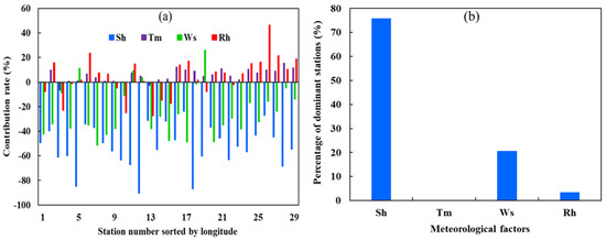 (a) Multi–year contribution rates of Sh, Tm, Ws, and Rh to summer Etp; and (b) the percentages of stations dominated by Sh, Tm, Ws, and Rh.
