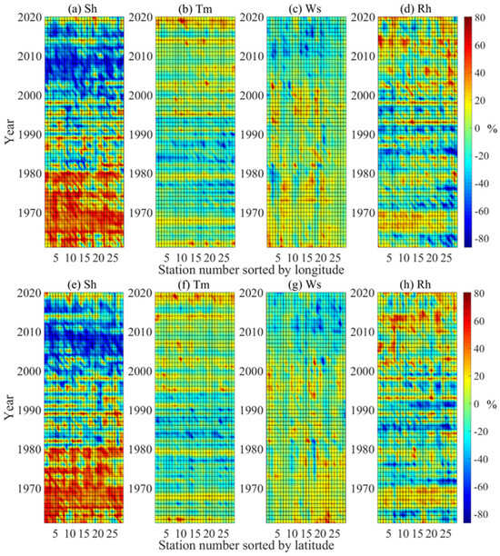 Relative contribution rates of Sh, Tm, Ws, and Rh to summer ETp at different stations in the HRB sorted by longitude/latitude. (note: (a) Sh, longitude; (b) Tm, longitude; (c) Ws, longitude; (d) Rh, longitude; (e) Sh, latitude; (f) Tm, latitude; (g) Ws, latitude; and (h) Rh, latitude).