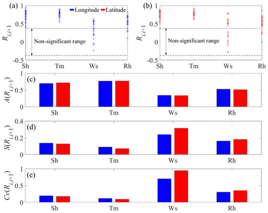 Longitudinal (a) and latitudinal (b) homogeneity analysis for contributions of four meteorological factors (Sh, Tm, Ws, and Rh) to summer ETp in the basin; and average values (c), standard deviations (d) and variation coefficients (e) of spatial homogeneity for the four meteorological factors. (note: Ri,i+1 denotes the contribution correlation coefficient between the ith and (i + 1)th stations regarding a specific meteorological factor, where i (i = 1~28) is the station number sorted by longitude (blue circles/bars) or by latitude (red circles/bars); Ri,i+1 beyond the non–significant range denotes the significant correlation coefficient under the 95% confidence level; and A(), S(), and Cv() represent the operations of calculating average value, standard deviation, and variation coefficient (Cv = S/A), respectively).