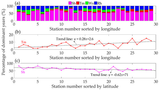 (a) Percentages of years in which Sh, Tm, Ws, and Rh dominate summer ETp in the HRB; (b) trend in percentage of years in which Tm dominates summer ETp with longitude; and (c) trend in percentage of years in which Sh dominates summer ETp with latitude (note: the dashed lines in (b,c) denote the significant trends of percentages of years dominated by Tm and Sh under the 95% confidence level, respectively).