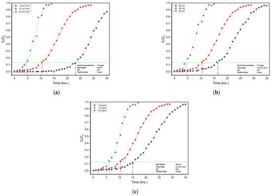 | Variation with Bed Depth (cm) | Variation with Flow Rate (cm3 min−1) | Variation with Feed Concentration (ppm) | |||||||