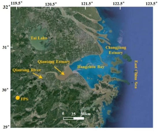 Hangzhou Bay is characterized by significant tidal fluctuations, rapid hydrodynamic forces, and elevated sediment concentrations, typifying it as a prominent trumpet-shaped estuary with robust tidal dynamics. Hangzhou Bay’s north shore is located at the southern edge of the Yangtze River delta (see Figure 1). The two locations also frequently exchange sediment. The primary source of sediment between Hangzhou Bay and the Qiantang River estuary is the southward transport of suspended sediment from the Yangtze River into the sea, along with re-suspended sediment from the muddy regions of the Yangtze River delta [1]. In Hangzhou Bay and offshore areas, approximately 40% of the sediment transported to the sea by the Yangtze River is deposited. However, human activities have significantly altered the conditions of water and sediment. As a result of measures such as soil and water conservation and the construction of reservoirs, the volume of sediment flowing into the sea at the mouth of the Yangtze River has dramatically decreased, from 500 million tons to less than 100 million tons [2,3,4]. The reduction of sediment entering the sea at the mouth of the Yangtze River and on the north coast of Hangzhou Bay, the area where the Yangtze River connects to the sea, would unavoidably be directly influenced by significant fluctuations in both the volume of runoff and the sand content of the river [5,6]. The hydrodynamic properties of both estuaries will be affected by the reduction in sediment volume from the Yangtze River estuary into the northern shore of Hangzhou Bay. Dai et al. [5] have documented the long-term effects of sediment reduction on estuarine geomorphology. They suggest that the reduction in sediment supply can lead to changes in the equilibrium state of estuarine systems, which may manifest over longer time scales. Therefore, under the altered water–sediment conditions, it is essential to explore the main pathways and factors influencing material exchange between the two estuaries.