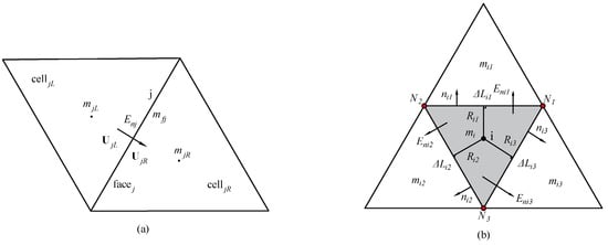 The numerical algorithm employed in this study utilizes the finite volume method to discretize the governing equations of shallow water dynamics. The computational domain is divided into triangular cells, and the equations are integrated over each cell to ensure conservation of mass and momentum. Figure 2 presents sketches of triangular meshes, comprising (a) a face (j) and its two neighboring cells (celljL and celljR); (b) an internal cell (mi) and its three neighboring cells. As mentioned below, the physical parameters shown in Figure 2 will be determined. At the nodes, bed elevations are first determined. The arithmetic average of the three component node elevations is used to calculate the bed elevation for a given cell, and this value is updated during the simulation. The cell center is where other physical characteristics are specified. If needed, the inverse distance interpolation method is employed to derive physical variables at the nodes. To enhance computational efficiency, the local time step (LTS) technique is utilized, allowing each computational cell to use the maximum permissible time step rather than adhering to a globally determined minimum time step (GTS) [22,26,27,28,29,30]. Additionally, GPU parallel acceleration is employed to improve computational efficiency further [27,31,32,33,34,35,36,37].