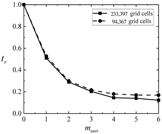 Numerical simulation accuracy is greatly influenced by mesh resolution; however, high-resolution meshes frequently result in a large increase in computation, which puts accuracy and computing efficiency at odds. This work introduces local time step (LTS) approaches and GPU acceleration to address this issue. Using two grid quantities (94,367 and 233,397), this study investigates how well these methods work to increase computational efficiency. This study determines the relative duration of running the model for an hour with various grid numbers in order to more intuitively assess the model’s efficiency improvement. Table 1 and Figure 4 demonstrate how the model run’s efficiency dramatically increases with muser value. The term “muser” refers to the hierarchical level parameter in the local time-stepping (LTS) framework, which quantifies the discretization scale multiplier for adaptive time-step allocation. Specifically, it determines the power-of-two multiple by which each computational cell’s local time step is scaled relative to the global minimum time step, ensuring compliance with the CFL stability condition while optimizing computational efficiency. The term “tr” refers to the relative efficiency, that is, the ratio of the running time under different GPU + LTS scenarios to that under the GPU-only scenario. The efficiency of running 94,367 grid cells increases from 53.353 s to 9.068 s when LTS is set to 5, while the efficiency of running 233,397 grid cells increases from 574.481 s to 80.517 s, or nearly six times. However, the increase in model running efficiency significantly slows down after muser ≥ 3. The efficiency of LTS is also impacted by the total number of grid cells; it is evident that the efficiency is comparatively improved, and the acceleration effect increases with the number of grid cells. As a result, LTS is more useful in complex scenarios involving a large number of grids and plays a larger role when there are more grids and the grid situation is more complicated.