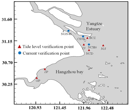 The following are the established boundary conditions for the model: The Yangtze River’s upper reaches are considered an open boundary, and their salinity is set at zero. The measured flow from the Datong station serves as the boundary condition. Similarly, the upper reaches of the Qiantang River are also considered an open boundary, characterized by minimal runoff and sand content, which exerts almost no influence on the hydrodynamics of the Yangtze River estuary, given the constant flow rate of 1000 m3/s. Additionally, the sand content is set to 0, while the salinity at the offshore boundary is fixed at 35 ppt. The tidal processes at each boundary point are determined using the tidal wave model, TPXO, as the offshore boundary condition. Water level fluctuations impact the inner continental shelf’s curved offshore open boundary, mainly taking into account the subtidal effects of M2, N2, K2, S2, Q1, K1, P1, O1, MF, MM, M4, MS4, and MN4.