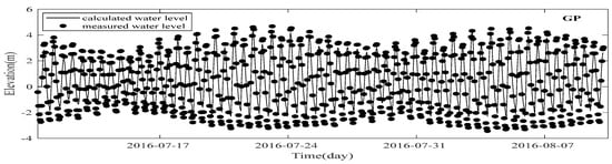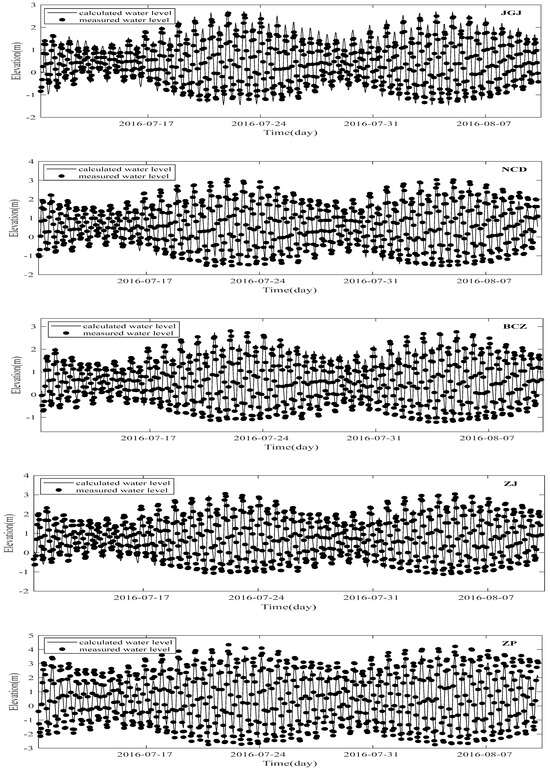 Between 10 July and 10 August 2016, the Yangtze River estuary and Hangzhou Bay underwent hydrodynamic validation. Tidal levels were measured at seven stations: Ji Gu Jiao (JGJ), South Trough East (BCZ), North Trough Middle (NCD), Zhong Jun (ZJ), Gan Pu (GP), and Zha Pu (ZP). Three tidal sites were selected for validation during the spring tide on 21 July 2016, from 7:00 to 11:00, and the neap tide on 27 July 2016, from 10:00 to 16:00. Figure 5 illustrates the locations of these sites. In this study, two parameters are introduced to rigorously quantify the performance of the proposed model: the Root Mean Square Error (RMSE), as expressed in Equation (6), and the Sum of Squares (SS), detailed in Equation (7) [42]. Figure 6 displays a comparison of the simulated and observed water levels, showing that the calculated outcomes correlate well with the actual data. The comparison between the actual and simulated tidal direction and velocity is shown in Figure 7.