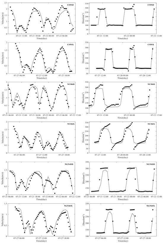 The RMSE and SS statistics for these simulations at various stations are compiled in Table 2. Since the SS obtained for both water levels and tidal currents at the site were more significant than 0.65, the simulations were all rated as “excellent” according to the technical rating scale for SS. There exists a strong correlation between the computed and observed tidal levels, suggesting that the model effectively simulates the tidal level changes across the seven stations. Overall, the simulation results are promising, as the simulated flow velocity aligns well with the trends observed in the measured flow velocity, and the simulated direction matches the observed direction closely. However, the simulated values fall short of capturing the complexities of the flow field, as evidenced by the validation curve. This discrepancy arises from the fact that the flow field observed in the field is more intricate than the computational results. Various factors that cannot be fully captured during the modeling process, such as topography and hydrometeorology, influence the actual flow field. Consequently, the factors accounted for do not precisely represent the real situation. Overall, it can be concluded that the computational results provide a more accurate reflection of the flow dynamics, effectively simulating the key characteristics of tidal levels and currents in the study area, thereby meeting the objectives of this paper. In other words, the hydrodynamic model developed here can more accurately represent the actual conditions within the Hangzhou Bay area of the Yangtze River estuary.