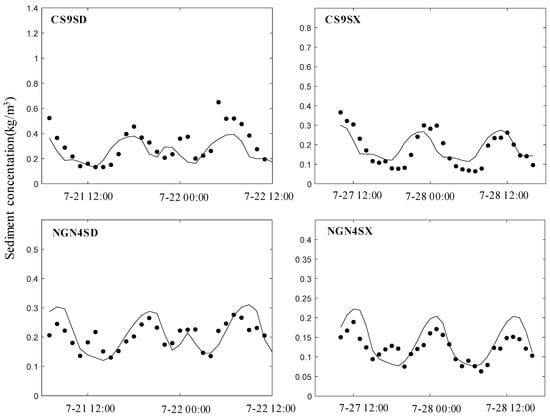 The model sediment concentration validation time was also selected during the spring tide on 21 July 2016, from 7:00 to 11:00, and the neap tide on 27 July 2016, from 10:00 to 16:00. Two validation measurement points, CS9S and NGN4S, were selected to verify the comparison between the sediment concentration and the measured values, and the comparison of the sediment concentration is shown in Figure 8. From the validation results, the trend of change between the simulated values and the measured values of each validation point is consistent, and the magnitude of the values is also in the same order of magnitude. On the whole, the model can better reflect the change of sediment and can be used to study the sediment transport law in the region.