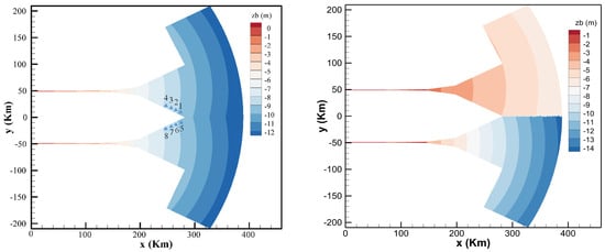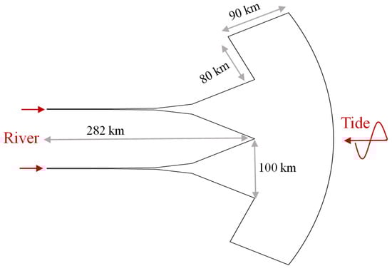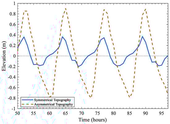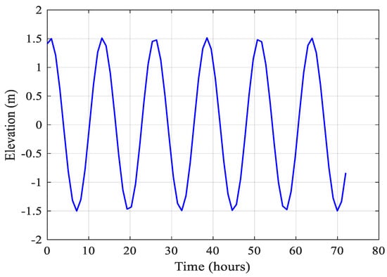 To systematically investigate the influence of the Coriolis force on adjacent estuarine water level differences, a generalized double-trumpet-shaped estuary model was developed. In this study, the estuary system is conceptualized as an idealized model featuring two adjacent estuaries, with a schematic representation provided in Figure 9 [44]. The estuary mouth width is set at 100 km. The open sea boundary is forced by the M2 tidal constituent, characterized by a tidal period of 12.42 h (see Figure 10). Figure 11 provides a detailed representation of the symmetrical and asymmetrical topographical features of the adjacent estuaries, along with the specific sites that were the focus of the study. The topographic elevation progressively descends from 0 m to −12 m along the longitudinal profile, with the water surface level maintained at 0 m. The baseline simulation scenario adopts a discharge rate of 10,000 m3/s (representing dry season conditions in the Yangtze River estuary) and a prescribed tidal range of 3 m. There are 28,615 grid nodes and 55,208 grid cells.