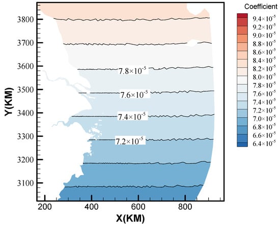where U denotes the vector of conserved physical quantities; F and G represent the flux vectors incorporating advective transport and hydrostatic pressure gradients; and S designates the source term vector accounting for bed slope effects and bottom friction dissipation. The variables t, x, and y correspond to time and horizontal spatial coordinates, respectively. The water depth h, depth-averaged velocity components u (x-direction) and v (y-direction), and gravitational acceleration g = 9.8 m·s−2 define the hydrodynamic parameters.  c k  represents the depth-averaged volumetric sediment concentration;  c s a  refers to the depth-averaged salinity concentration; Ek and Dk are the size-specific sediment erosion and deposition fluxes;  p 0  is the bed sediment porosity, taken as 0.42; The bed slope terms  S b x  and  S b y  are derived from the spatial gradients of the bed elevation  Z b S f x  and  S f y  are the friction slopes in the x and y directions, which are calculated by Equation (4) following. The evaluation of bed slope terms is conducted utilizing the slope flux method [23]. Additionally, the estimation of bed friction terms is performed through the application of the splitting point-implicit method [24].  f  is the Coriolis coefficient,  f = 2 w sin φ . ω is the Earth’s angular velocity, and φ is the latitude; ce,k is the sediment transport capacity of the k-th size class of sediment determined using the formula of Zhang et al. [25].  m 0 = 0.92 K 0  is an empirical coefficient taken as 0.12.