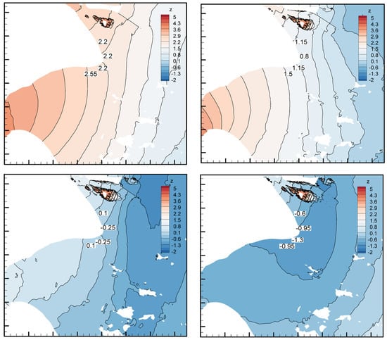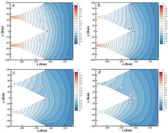 Figure 20. Planar distribution of tidal levels under different Coriolis coefficients ((a) without; (b) 30° S; (c) 60° S; and (d) 85° S).