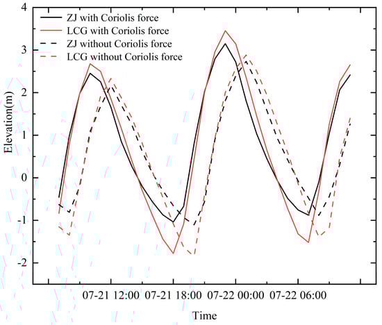 Two key stations, LCG and ZJ, were chosen for analysis, and their latitudes along with Coriolis parameters are presented in Table 4. Comparative tidal level plots for these stations during spring tide conditions were created. As shown in Figure 14, the Coriolis force results in high tidal levels occurring approximately two hours earlier at individual stations, thereby inducing a phase shift across the entire tidal curve. The Coriolis force alters the propagation dynamics of a rotating tidal wave system by introducing a lateral deflection of the current motion, resulting in differences in the propagation velocity of the leading edge of the wave at different latitudes.