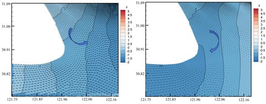 The tidal dynamical processes in Hangzhou Bay are also impacted by the Coriolis force. Figure 15 shows the current flow patterns close to Nanhui Shoal, where Hangzhou Bay and the Yangtze River estuary converge. The model comparison shows different flow patterns: when the Coriolis force is absent, estuarine currents go southeast, in accordance with the tidal effect. However, the flow vector is redirected toward Hangzhou Bay due to a notable rightward deflection caused by Coriolis forces. An interchange of water and sediment occurs from the Yangtze River mouth to Hangzhou Bay during the ebb tide as a result of the Coriolis effect in the Northern Hemisphere deflecting the current to the right of its direction of motion.