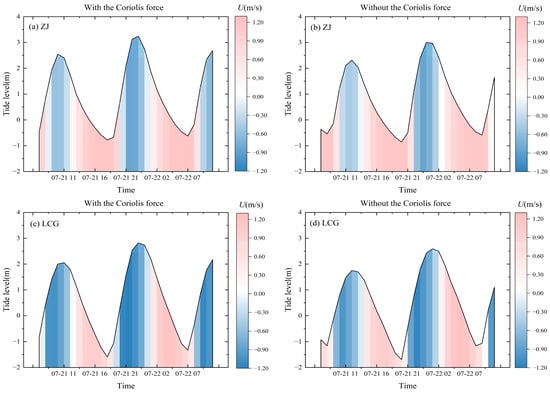 Figure 16 shows that the effect of the Coriolis force on the flow velocity distribution and water–sand exchange was characterized by significant spatial differentiation. In LCG, the Coriolis force tends to increase the flow velocity at high tide (u < 0), while the flow velocity at low tide (u > 0) tends to decrease. This asymmetric regulation causes the high tide duration to be shortened by approximately 1.2 h and the dominant flow duration to be prolonged at low tide, hence creating a notable tidal asymmetry. The ZJ station exhibits the opposite pattern, with the flow velocity at high tide being comparatively weaker and the Coriolis force increasing the peak flow velocity at low tide. By altering the flow velocity distribution and tidal dynamics properties, the Coriolis force has a substantial impact on tidal asymmetry and its function in regional water–sand exchange.