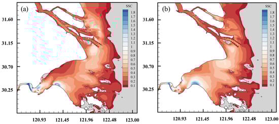 Figure 17. Distribution of the sediment concentration with and without Coriolis force ((a) Coriolis force excluded; (b) Coriolis force included).