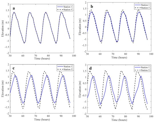 Figure 18. Effects of different Coriolis coefficients on Stations 1 and 5 ((a) without; (b) 30° N; (c) 60° N; (d) 85° N).