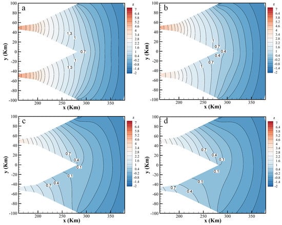 In the absence of Coriolis force, it is evident that the distribution of tidal levels at the confluence of nearby estuaries is entirely symmetrical, with no variation in tidal levels. The tidal level distribution on the north and south banks of a single estuary is likewise symmetrical. At ebb tide in the Northern Hemisphere, the Coriolis force will cause the current to deflect to the right side of the direction of movement, causing the water level of the north bank of the estuary to fall and the water level of the south bank to rise [45,46,47,48,49]. This is reflected in the nearby estuaries, where the tide level of the south bank of the upper estuary is higher than that of the north bank of the lower estuary, resulting in the tidal level difference, as illustrated in Figure 18. The water level on the north bank of the estuary rises, and the water level on the south bank falls at low tide in the Southern Hemisphere due to the Coriolis force, which deflects the current to the left of the direction of motion. This phenomenon is mirrored in the neighboring estuaries, where the tidal level on the north bank of the next estuary is higher than that on the south bank of the preceding estuary (see Figure 20). The distribution of the tidal level between the confluence of two estuaries becomes increasingly asymmetrical, and the asymmetry of the tidal level distribution within a single estuary becomes more noticeable as the Coriolis force coefficient and its influence grows. This indicates that the distribution of water levels and the difference in water levels across adjacent estuaries are influenced by the Coriolis force.