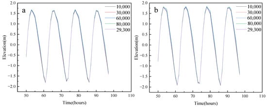 Figure 21. Tidal stage plot of station 1 and station 4 under different discharge conditions ((a) station 1; (b) station 4).