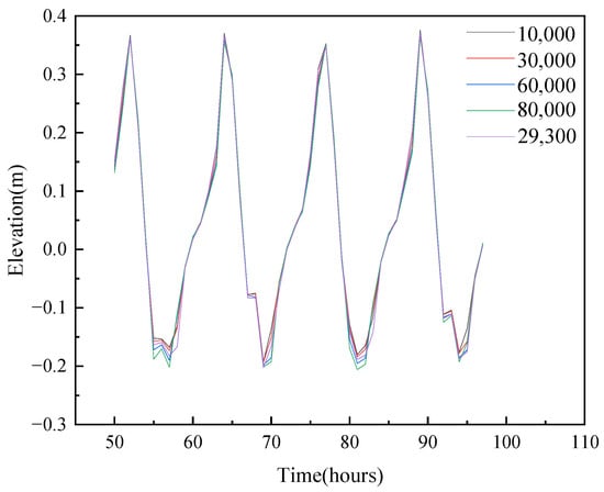 Cases 4, 10, 11, 12, and 13 investigate discharge impacts under constant Coriolis parameter ( f = 2 w sin 30 , Ω = 7.29 × 10−5 rad/s) and 3 m tidal range modulation. Hydrometric analysis reveals limited stage variation between dry seasons (Q = 10,000 m3/s), wet seasons (Q = 60,000 m3/s), average flow, and extreme flooding (Q = 80,000 m3/s) at the monitoring stations 1 and 4 (see Figure 21). Notably, both high and low tidal levels exhibit discharge-dependent amplification, attributable to river-tide hydrodynamic interactions. Importantly, the discharge does not alter the differences in tidal levels between adjacent estuaries. As depicted in Figure 22, the tidal level differences between Site 5 and Site 1 remain essentially consistent across varying discharge conditions. The results show that changes in river flow have a limited effect on tidal levels and a negligible effect on the water level gradient in nearby estuaries.
