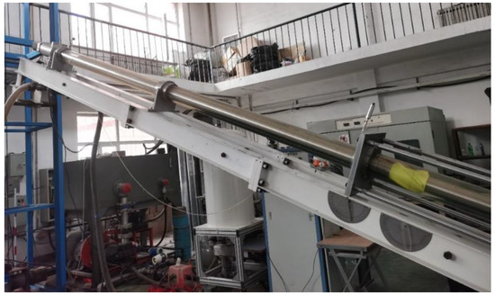 This study utilizes a large-scale closed-loop flow loop system to investigate the transportation of blocky cuttings particles in drilling fluid. As illustrated in Figure 1, the experimental setup consists of three primary components: a fluid circulation system, a data acquisition system, and a motion control system. The core test section consists of a transparent acrylic tube with a total length of 5.5 m, an outer diameter of 0.16 m, an inner diameter of 0.12 m, and a wall thickness of 20 mm. The use of acrylic ensures sufficient mechanical strength and optical transparency, enabling real-time visualization of the flow behavior of cuttings within the drilling fluid.