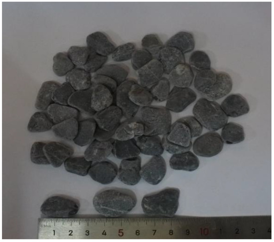- Simulated cuttings: To mimic the behavior of blocky cuttings in the wellbore, natural gravel with a density of 1.8 g/cm3 is mechanically crushed and sieved to achieve a particle size range of 20–40 mm (Figure 2). The particles are specifically shaped to have a flaky morphology, controlled by a two-dimensional shape factor (Feret diameter ratio) within the range of 0.25–0.35, simulating the brittle fracture characteristics of shale formations. Specifically, the blocky cuttings size in this study refers to the equivalent diameter of irregularly shaped large-size cuttings, which was determined based on a mass-to-volume conversion method. The volume of each cutting particle was estimated from its weight and known density, and the equivalent diameter was calculated assuming a spherical shape with the same volume.