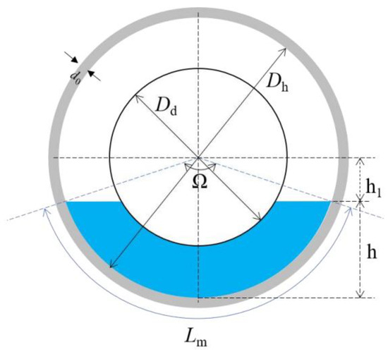 where: Lm is the observed arc length on the exterior of the acrylic tube; Ω is the central angle; h1 is the height variable; d0 is the wall thickness of the acrylic tube; D is the inner diameter of the acrylic tube; Dh is the diameter of the borehole; Dd is the diameter of the drill pipe.