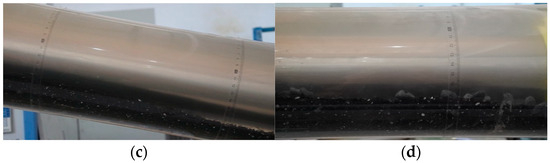 Following the injection, the liquid–solid mixture is separated using a vibration screen, and the drilling fluid is returned to the storage tank for reuse. Once the cutting bed reaches a stable height, the position of a transparent scale is recorded to calculate the arc length of the cuttings bed. Additionally, fluid flow rates and borehole inclination angles (an inclination of 90° corresponds to a horizontal well section) are measured under different flow conditions by adjusting the frequency converter and maintaining a steady flow [28,29].