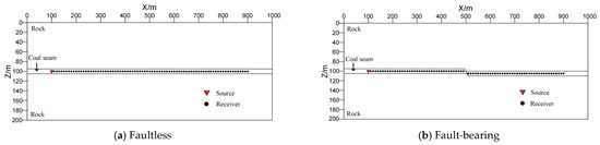 Figure 2a shows a model with a uniform horizontal coal seam, while Figure 2b includes a fault structure located at X = 500 m, with a fault throw of 5 m. The specific physical parameters of the models are detailed in Table 1.