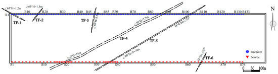 The experimental setup involved placing seismic sources and geophones along the tunnel in the working face. Both the geophone and shot point spacing were set to 10 m. Considering the tunnel equipment and production conditions, a total of 133 receivers and 76 effective sources were arranged (Figure 3). Data collection was carried out using the “one shot, multiple recordings” method, and a total of 76 Common Shot Point gathers were collected.