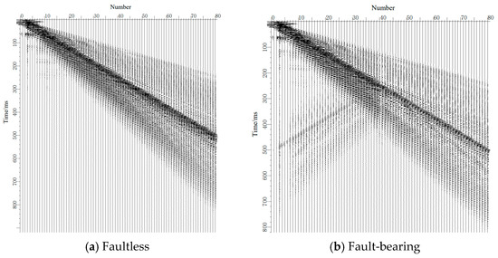 The channel wave records of three-dimensional models of two types of coal-rock media were obtained through simulation, as shown in Figure 4. By comparing the channel wave records of the two models, it was found that in the channel wave signal of the model with a fault, there was a sudden decrease in energy starting from the 40th trace.