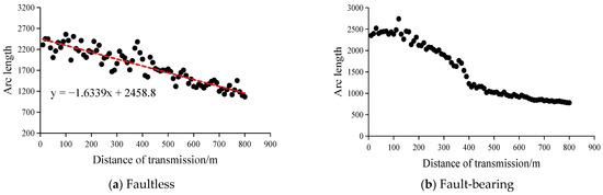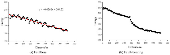 According on Formula (2), The arc length calculation results are shown in Figure 7. Since the arc length is a measure of the channel wave waveform length without a defined unit, the arc length data is dimensionless. Figure 7a presents the calculation results for the model without a fault (as in Figure 2a), while Figure 7b shows the results for the model with a fault (as in Figure 2b). In both figures, black dots represent the arc lengths of the channel wave signals, and the red dashed line indicates the trend line. As seen in Figure 7a, the arc length of the channel wave signals shows a linear decay characteristic, decreasing with increasing propagation distance. In Figure 7b, a clear arc length attenuation anomaly appears at X = 400 m. These phenomena suggest that the arc length decay characteristics of channel wave signals are also sensitive to geological anomalies and maintain a linear relationship with propagation distance, making it another valuable parameter for channel wave tomography.