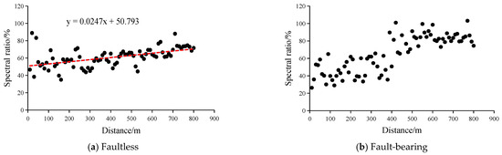 Based on Formula (1), the spectral ratio of the numerical simulation signals is depicted in Figure 6. Figure 6a presents the calculation results of the numerical simulation signals from the faultless model depicted in Figure 2a, whereas Figure 6b showcases the results from the fault-bearing model as illustrated in Figure 2b. The black dots represent the spectral ratio of the channel wave signal, and the red dashed line indicates its trend. In Figure 6a, the spectral ratio exhibits a linear growth pattern, increasing with propagation distance. Figure 6b shows a significant increase in the spectral ratio at X = 400. These phenomena indicate that the growth characteristics of the channel wave spectral ratio exhibit a linear relationship with propagation distance and are sensitive to faults, making them useful parameters for channel wave tomography.