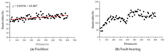 The bandwidth calculation results are shown in Figure 8. Figure 8a presents the calculation results for the model without a fault (as in Figure 2a), while Figure 8b shows the results for the model with a fault (as in Figure 2b). In both figures, black dots represent the bandwidth of the channel wave signals, and the red dashed line indicates its trend. As seen in Figure 8a, the bandwidth of the channel wave signals exhibits a linear increase with increasing propagation distance. In Figure 8b, a clear bandwidth increase anomaly appears at X = 400 m. This indicates that the bandwidth is also a useful parameter for channel wave tomography.